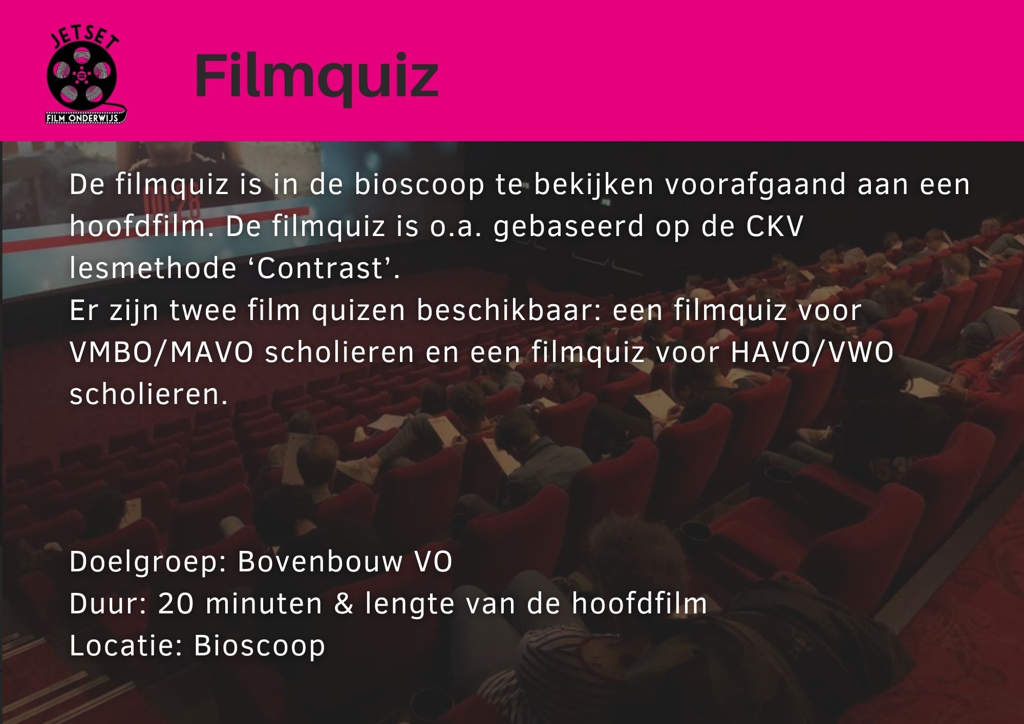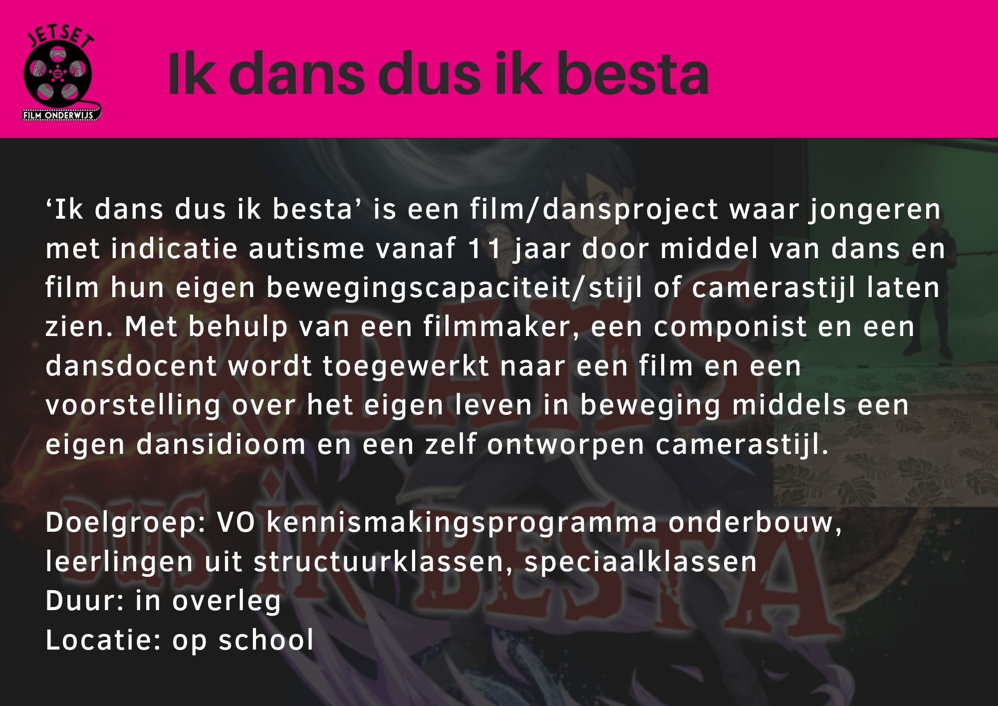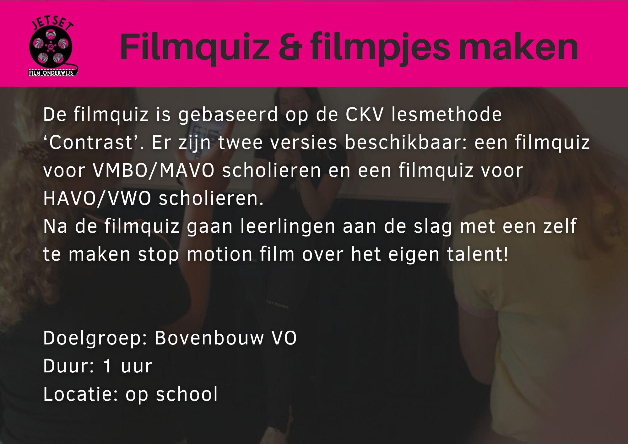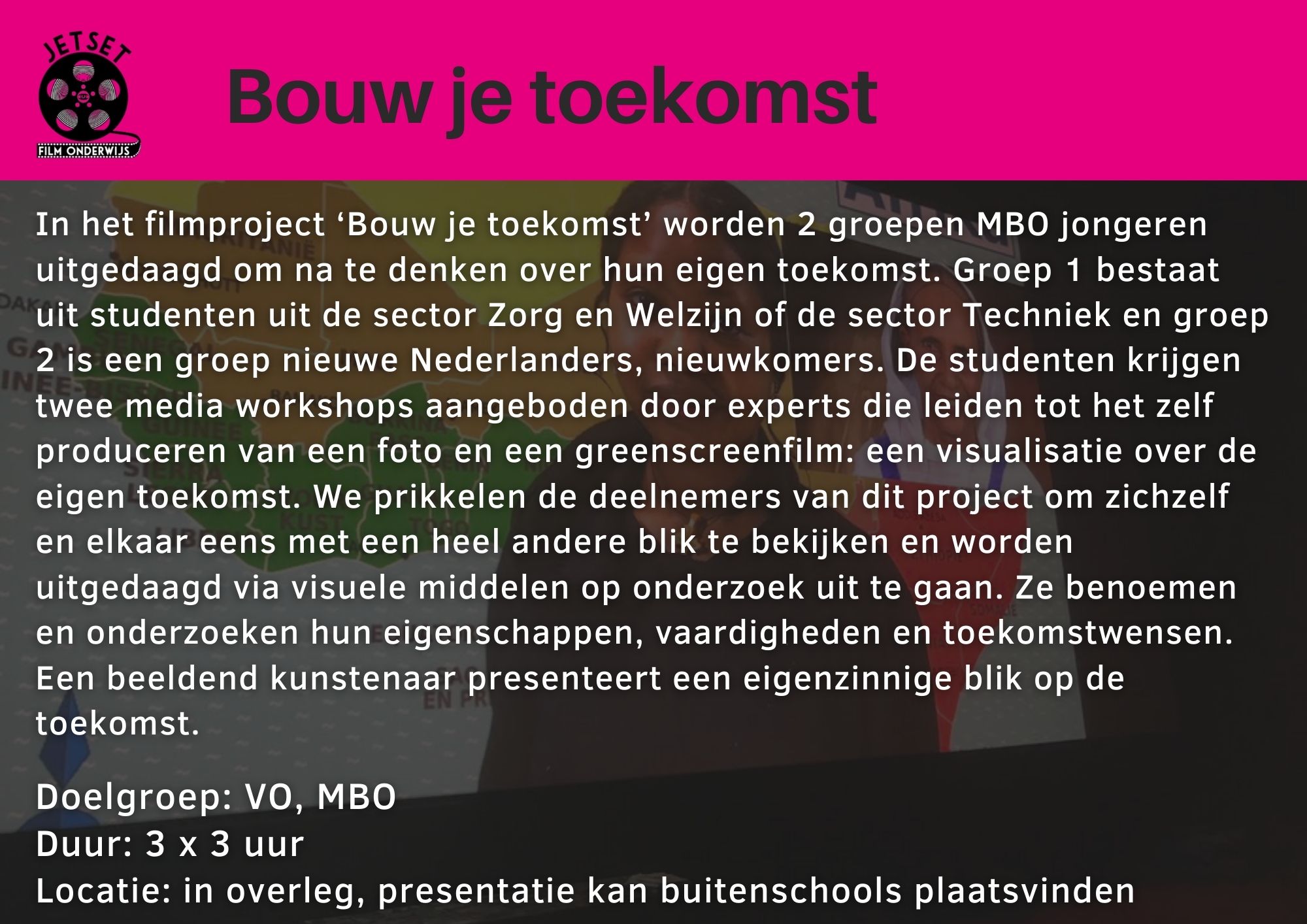 JetSet voor filmonderwijs creëert media onderwijsprojecten met een maatschappelijke inslag zoals burgerschap, duurzaamheid of mediawijsheid.